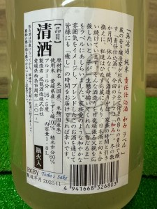 今回は愛媛県西条市で1877(明治10)年創業、成龍酒造の「賀儀屋 純米 責任仕込酒 和み ラベル」です。
