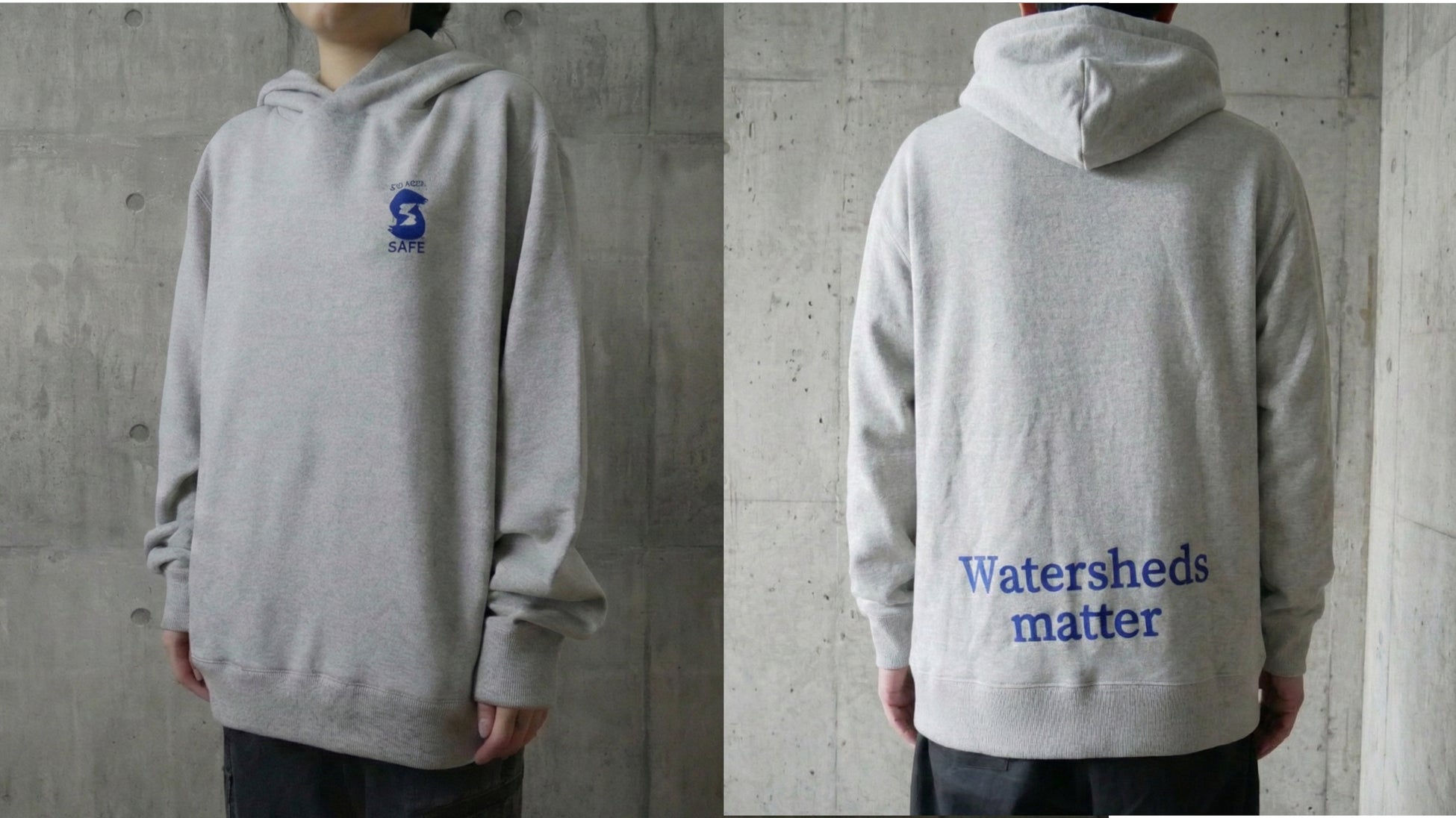 もう一つは、同じく循環素材を使い、Salmon-Safeロゴとメッセージを配したフーディーです。エイジレス、ジェンダーレスで着用いただけるようなデザインで、秋冬から春先まで楽しんでいただけます(サイズはフリーサイズ)。背面下部にはSalmon-Safeが大事にしている「流域」への意識醸成を伝えるメッセージ「Watersheds matter(流域が重要である)」を記しています。